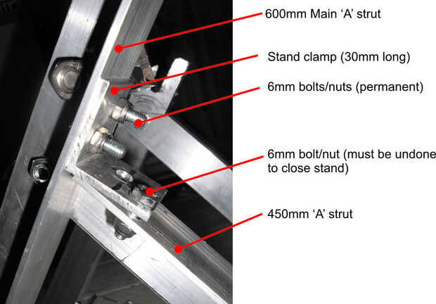 La abrazadera de soporte es una pequeña sección de la sección de ángulo (30mm de largo) que se emperna a lo 600mm principal 'A' marco puntal lado A. Esto es puntal a lo otros 'A' marco puntal cuando el soporte se dobla hacia fuera. Debe ser deshecho para cerrar el stand.