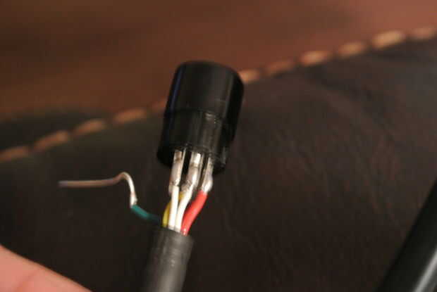 Si usted desenroscar los tornillos de cabeza phillips pequeño en el conector, puede tire hacia atrás y exponer a los terminales de soldadura en el enchufe. Esto, lo hice. A continuación, con un alcance y un DMM, pude suss las siguientes: soldador 6 patillas: