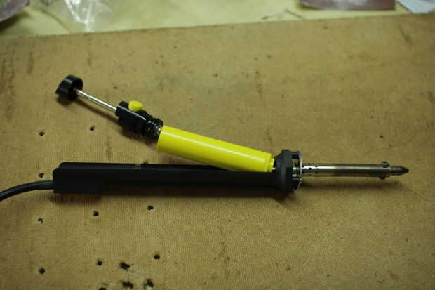 Primero debemos desmontar nuestro desoldador. Tiene un cuerpo, un cilindro amarillo, un resorte y un pistón.