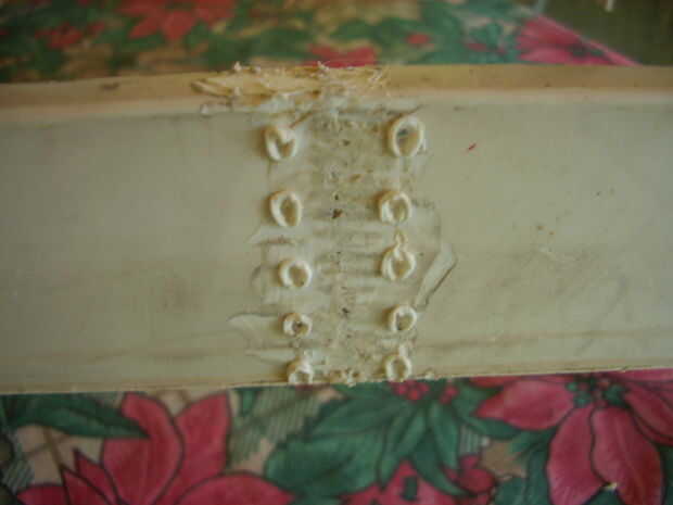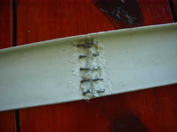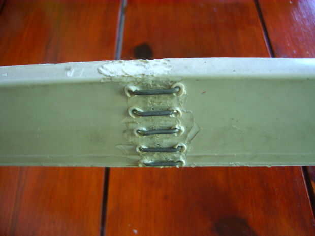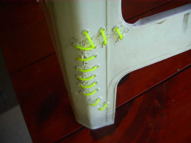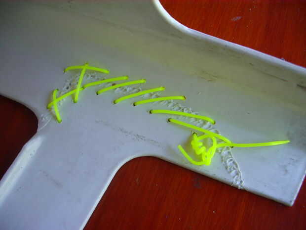 Ya que en este caso la seguridad es muy importante, como se explica en el paso 1, me aseguré de que la rotura no se produzca de nuevo, o al menos reducir la probabilidad de recurrencia. Para ello hice con la punta de soldadura una serie de agujeros en ambos lados de la soldadura, luego cortar aproximadamente una pulgada de alambre galvanizado de grosor medio e hizo algunas grapas que pasaron a través de los agujeros como clips de papel y cerraron. En este caso es importante tener en cuenta que los orificios no deben ser demasiado cerca de la soldadura, porque ellos deben tener suficiente material para evitar el craqueo del plástico entre el orificio y la soldadura. También utilicé mi línea de nylon, que utiliza la bordeadora, pero me encontré con la dificultad de hacer el nudo final eficaz. De todos modos, no creo que esté fuera de lugar.