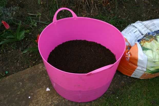 y aquí está el envase terminado con unos orificios de drenaje perforado en la parte inferior, algunos suelos y ocho de semilla de papa enterrado dentro. Pude haber compré uno en un centro de jardinería temprano en el día por 5 libras. Ciertamente, habría sido un bonito color verde intenso pero todavía, que era 5 libras demasiado para poder pasar.