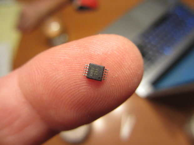Un soporte de chip de un bloque de madera y un hilo elástico y una superficie conductora.
