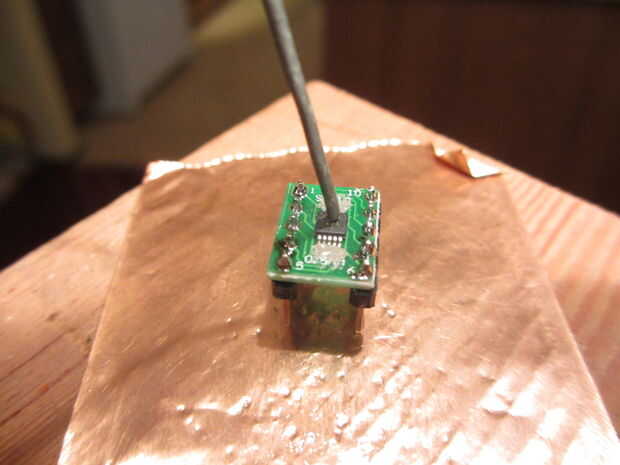 Aplicar goma de la soldadura. Si el chip tiene el tono muy pequeña 0,5 mm que desea aplicar poniendo algo en la punta de un alfiler. ¿Cuánto? Una gota en la cabeza del perno es mucho, más como un micro dab. Utilice la lupa. Se verá después de poner el primer lenguado abajo probablemente querrá quitar parte de la dab con el pasador. Borrón de transferencia del lenguado a través de todos los rastros de la tierra. La pasta corta todos los rastros juntos, eso es fino. Cuando la goma se derrite le mecha su camino fuera de los espacios entre las tierras, pero no si se es que mucho pegar al Comité. Por esta razón es mejor tener poca pasta que a mucho. Siempre puede agregar más pasta y funden otra vez. Pines de soldadura en cortocircuito limpiadas es más difícil que añadir más pasta de la soldadura más adelante pero lo arreglo si tienes que. Con el paso de 0,5 mm chips aplicarán el pasado a la Junta y no los pines del chip. Hacerlo así puede crear cortos de soldadura. La soldadura se mecha es entre las patas del chip cuando derrite. Ver la imagen para la aplicación de la pasta adecuada. También puede utilizar un pequeño pedazo de papel doblado sobre un par de veces y sostenido con las pinzas para quitar el exceso de pasta. Es más fácil limpiar el exceso de pasta ahora en lugar de después de que se derrita.
