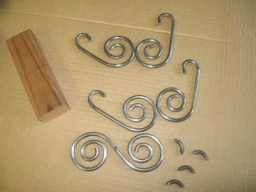 Corte un bloque de madera 6 1/2 pulgadas de largo por 2 pulgadas de ancho por 1 1/2 pulgadas alta para abrazadera o tornillo las piezas en lugar cuando virar de la soldadura. También se muestra son cuatro patas fabricadas de varilla doblada 1/4 de pulgada. Bolas de acero pequeñas también hacen buenos pies. [Ver cuadro acabado]