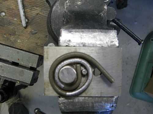Después de dos curvas completadas, la barra espaciador temporal se verá como la foto. Hemos sombreado el área de la varilla que se utilizará para el espaciador. Retire la varilla en espiral de la dobladora y corte [usando una sierra para metales] y guarde el pedazo de sombra blanco.