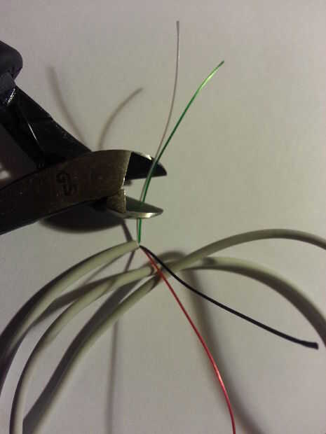 Sólo tenemos los cables rojo y negro del cable USB. Saque unos 5cm de aislamiento y corte los cables blanco y verde los datos.