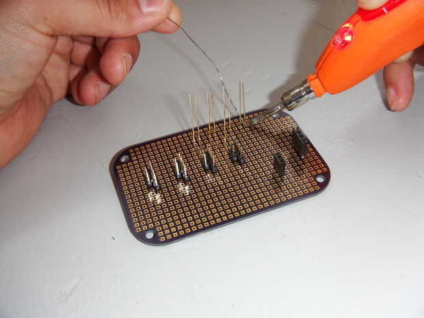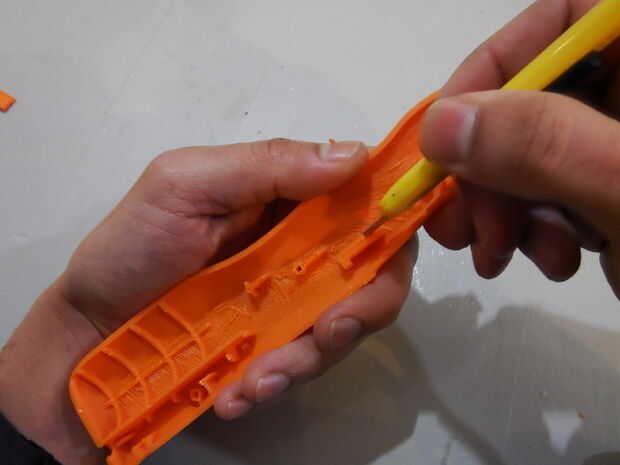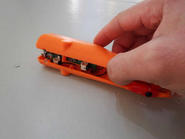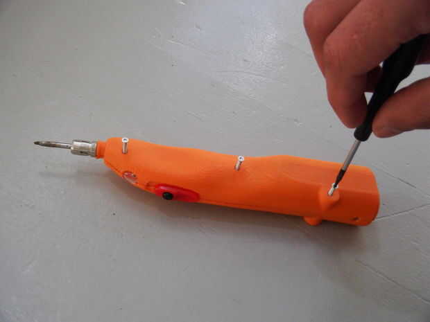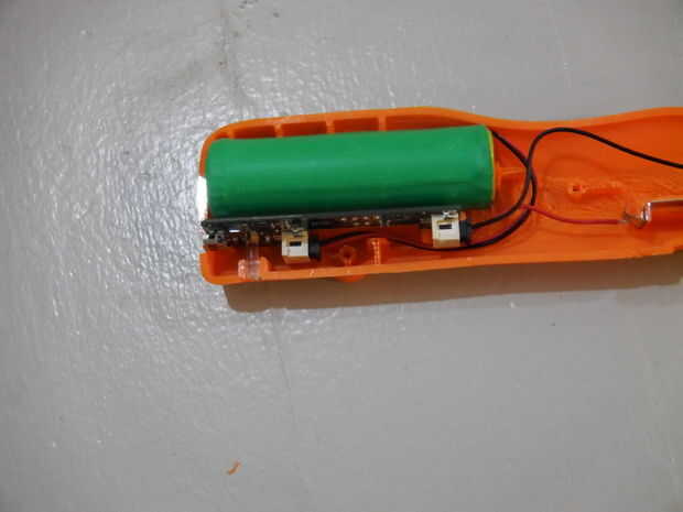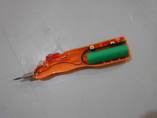 Después de imprimir el soldador nuevo caso, limpia con un cuchillo de la manía, luego coloque el elemento de calefacción, resortes de metal, interruptor y ventanilla en los lugares indicados en la imagen.