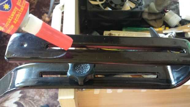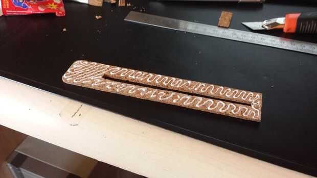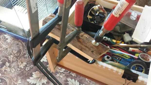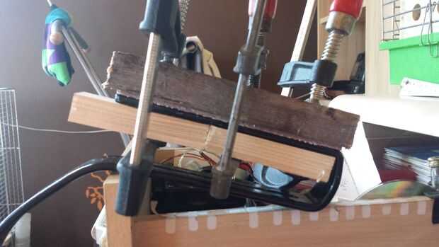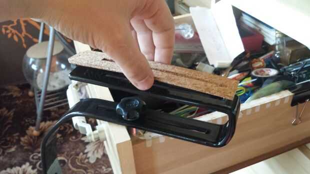 Después de que un pedazo de alfombra de corcho manchar su pegamento modelado de la misma manera como en la imagen y péguela a la parte superior de la steadicam. Después de pegarse la colchoneta de corcho forrado con trozos de madera y vice las abrazaderas. Dejar durante varias horas secar. Siguiente paso