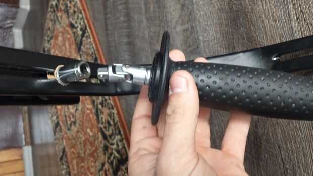 Apriete el accesorio de explotación en la parte media del steadicam como en la imagen y el tapón de rosca con prensado tuerca M6. Pasujądo tapa y cardan entre sí y pueden eliminarse colocando 1/4 de pulgada. El mango se combinan y sigue adelante. Siguiente paso