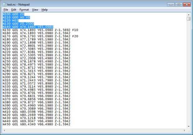 Esto resultará en FreeMill haciendo algunos cálculos y luego abriendo una ventana de Bloc de notas con GCode resultante. FreeMill asume que usted está ejecutando esto en un molino CNC real, por lo que pone un puñado de inútiles comandos en la parte superior y parte inferior del archivo. Mientras está abierto en el Bloc de notas, vamos a ir adelante y conseguirlos fuera de allí.