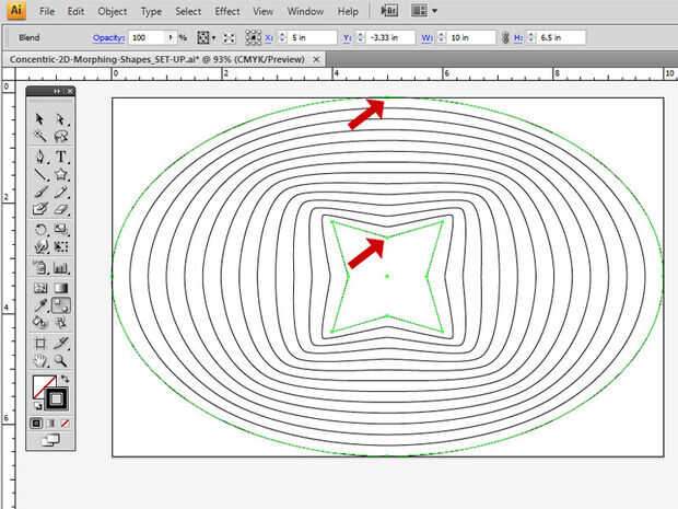 • Ahora tienes un especial "mezcla" cursor icono, haga clic una vez en el punto medio horizontal superior del óvalo, entonces haga clic una vez en el punto medio horizontal superior de la estrella... y Voila! Ha creado 12 formas morphing.
