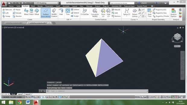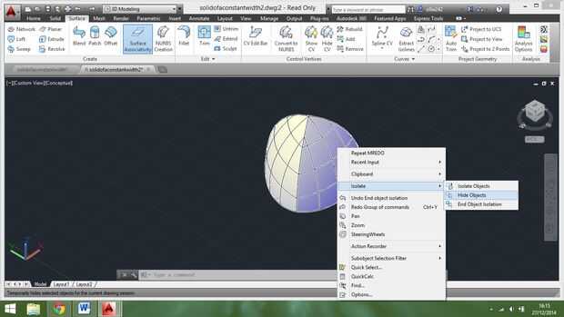 Tenemos que ser capaces de extraer 3 de los bordes podemos reemplazarlos con un borde curvado. Para ello vamos a utilizar el comando slice pero primero vamos a necesitar crear superficies que podemos usar para cortar el objeto. Las superficies deben estar situado en el mismo plano que las caras del tetraedro que hicimos al principio, así que en vez de hacer 4 nuevas superficies desde cero podemos convertir caras de tetraedro en superficies pero primero tenemos que ocultar el sólido. Para ello, seleccione el objeto y luego haga clic derecho y seleccione "aislar" luego elige "ocultar objetos" y todos que deben tener es el tetraedro original. También debemos eliminar el triángulo original y reemplazarlo con líneas para que podamos hacer las caras:
