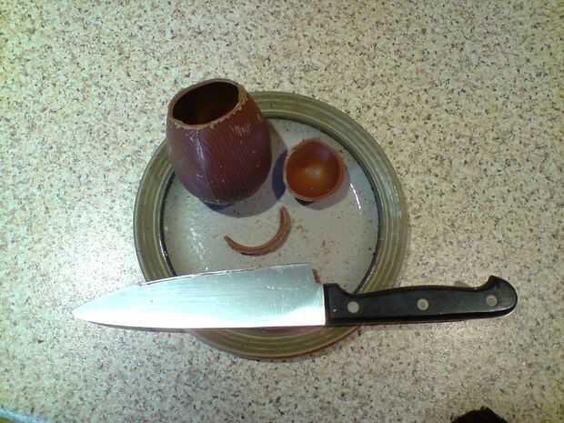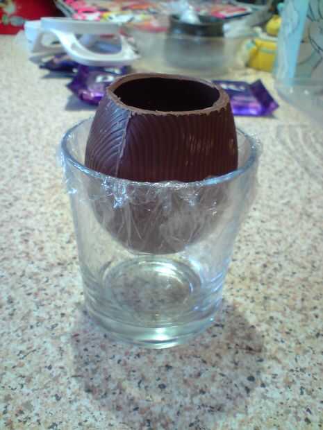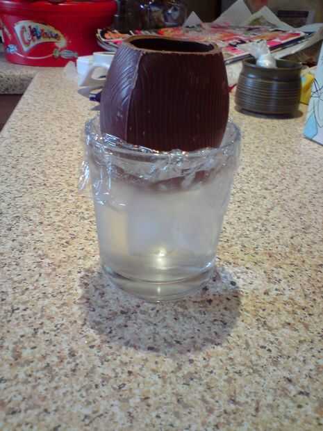 Comenzar por cortar una tapa de 3cm de la parte superior del huevo. Demasiado ancho y allí será demasiado chocolate en él cuando vuelva a conectar, demasiado delgada y usted será difícil bajar el chocolate derretido. Envuelva la parte inferior hasta el agujero en film transparente y el lugar en el agua y el hielo llena el recipiente, entonces ponlo en la nevera para frenar el deshielo. Coloque la tapa en un plato a un lado.