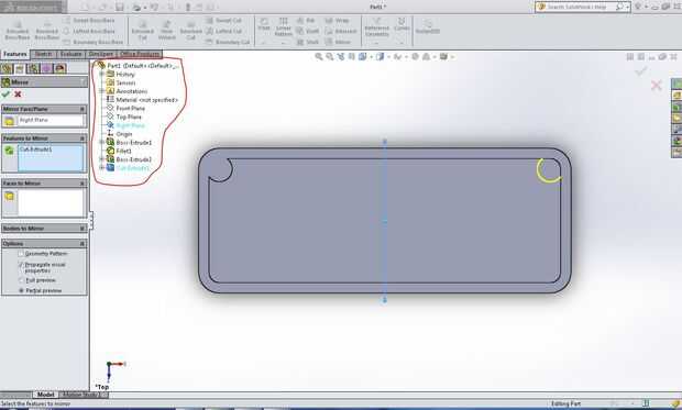 3. Seleccione la función que desea espejo (el corte hecho en el paso 7) Repita los pasos del espejo los orificios en la parte inferior. Seleccione el plano frontal como el plano de espejo (puede seleccionar más de un función de espejo a la vez)