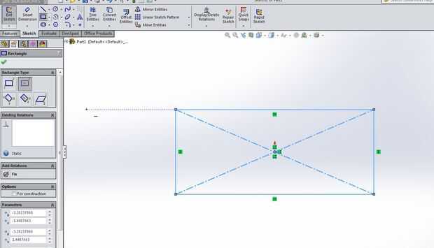 Todas las herramientas utilizadas en este tutorial se encuentran en ciertas fichas ubicadas en la parte superior de la pantalla. Utilizar la herramienta de rectángulo (se encuentra en la pestaña Dibujo) para crear el rectángulo base. Siempre es una buena idea para centrar sus piezas sobre el origen, por lo que la mejor herramienta de rectángulo para usar es el que se define por el punto central y un punto de esquina (segunda opción en el menú tipo de rectángulo en la ventana de herramientas situado en el lado izquierdo de la pantalla).