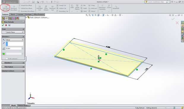Para hacer tu dibujo en 3D figura utilice la herramienta de extrusión Base jefe encontrada en la ficha función. Al hacer clic en cualquiera de las herramientas, aparecerá una ventana de administrador en el lado izquierdo de la pantalla; Esto es donde configuras los parámetros para las funciones (profundidad de la protuberancia.), dimensión de filetes, etc.