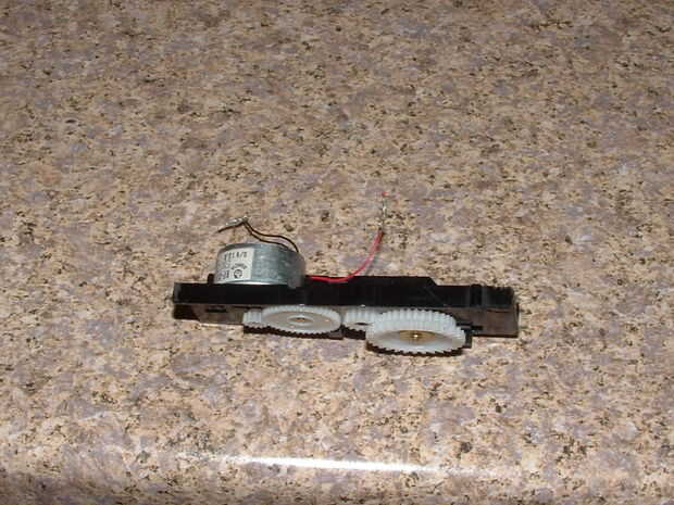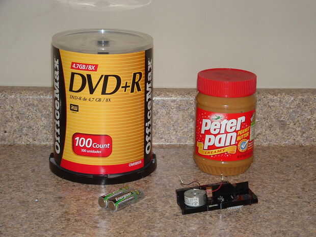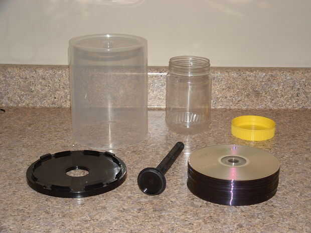En realidad hay tres partes principales a esto, todos los cuales se encontraron en mi casa. La parte más importante es el motor eléctrico que se puede salvar de cualquier número de electrónica. Este particular vino desde una unidad de disco no funciona y el motor fue utilizado para abrir y cerrar la bandeja. Dejé los engranajes conectados y solo corte el plástico alrededor de él para que todo me alojé intacto. También se necesita es un frasco vacío de mantequilla de maní con la tapa y una cubierta de DVD grabable 100, que debe ser el tipo donde el huso se desenrosca de la base en comparación con el tipo que se fija en su lugar. Necesitarás algunas otras probabilidades y extremos como un pequeño anillo de plástico de la pila de grabación DVDs, algunos popotes cocteles, cuatro piezas de corto (3 a 4 pulgadas o menos) galvanizado alambre y algo para fijar el motor abajo más adelante en el proceso.