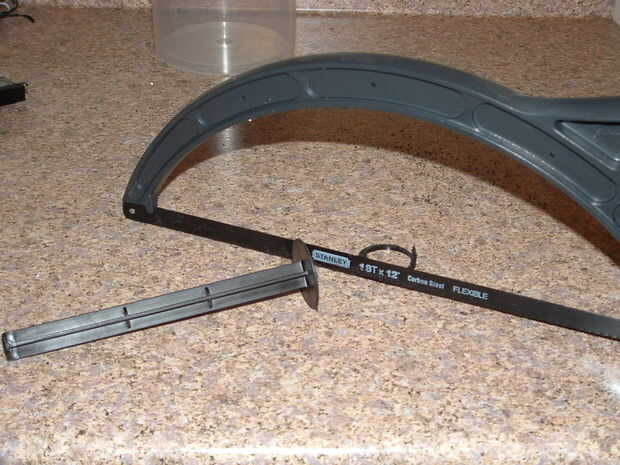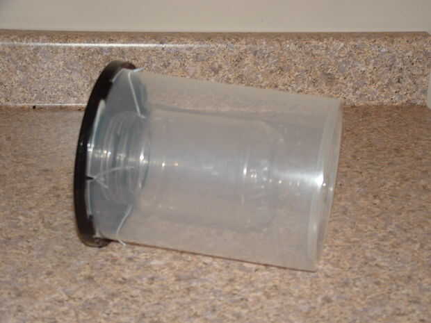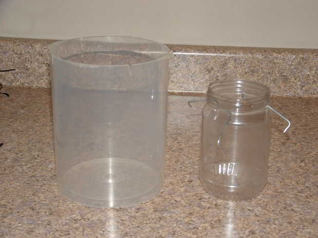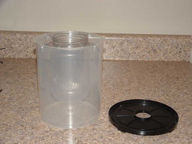 Tuvo la suerte de tener el motor eléctrico ya montado en algo utilizable, por lo que te voy a olvidar por ahora. Para comenzar con, perforé cuatro agujeros uniformemente espaciados (comentar) en el tarro de mantequilla de maní en el cuello de la botella. Entonces corté cuatro muescas en el caso de DVD para corresponder. No demasiado profundo, lo suficiente se puede colgar un trozo de alambre sobre el borde sin interferir con la atadura de la base otra vez. Luego funcionó un alambre por los agujeros y colgar el tarro de mantequilla de maní en el caso de DVD al revés. Finalmente, usé una sierra para cortar la rosca del husillo por lo que pude pegar el engranaje directamente a él.