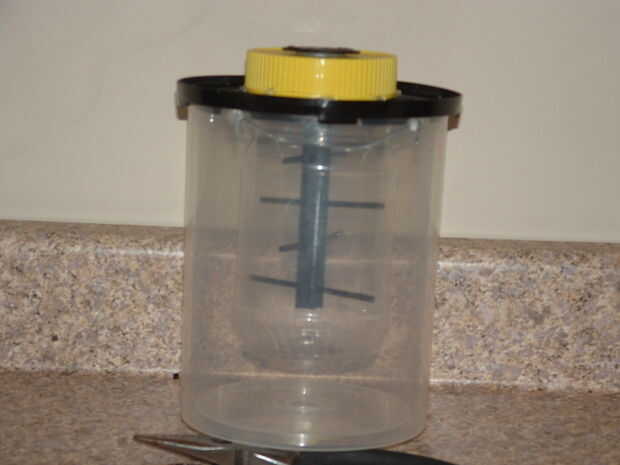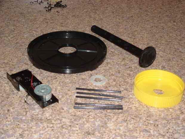 Perforar algunos agujeros en el husillo y cortar los popotes cocteles donde encajaría en el tarro de mantequilla de maní, entonces se inserta (sin pegamento) en el husillo. Nada dentro del frasco debe contener pegamento y lo más importante no debe contener soldadura! Un montón de soldadura contiene plomo, que es malo, como podría decir cualquier pirata que se precie. A continuación, corte un agujero en la tapa de tarro de mantequilla de maní lo suficientemente grande para el eje que gire libremente, pero pequeño suficiente para ayudar a mantenerlo en línea. Tomé los husos, añade una arandela de separador plástico al huso, luego la mantequilla de cacahuete tarro tapa, y luego el DVD base y poner las pajitas cocteles en. Pegué la tapa de tarro de mantequilla de maní a la base para mantener en su lugar, y luego una vez más hizo que todo cabe. Oh, también corté el husillo a profundidad de tarro de mantequilla de maní.