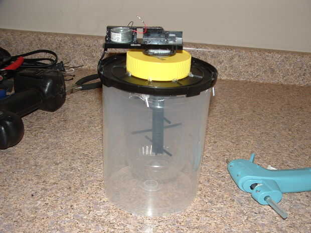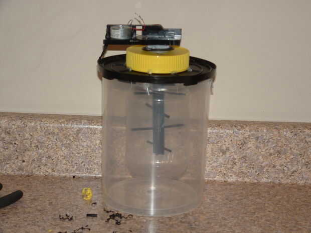 El engranaje más grande que a lo largo de las ranuras en la bandeja de disco colgado hacia fuera más lejos que los otros engranajes, así que pegué el eje directamente a ese equipo. También perforé un agujero pequeño en el lado de la base negra y la carcasa del motor eléctrico para atar el motor y mantenerlo sólo gire sobre la heladera. Probablemente sería mejor hacer realmente, pero esto funcionó y me fui con él.