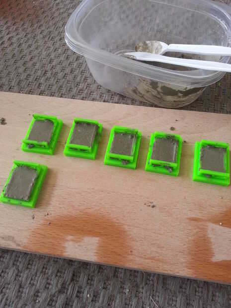 Una vez una cuchara su concreto premezclado en sus moldes. Después coloqué el concreto en mis moldes solía un cuchillo de plástico Presione el hormigón en el molde y luego nivel/rasurado de la parte superior. Una vez afeitado toque mis moldes sobre una superficie dura varias veces para obtener todo lo necesario para instalarse y cualquiera atrapado burbujas de aire hacia fuera.