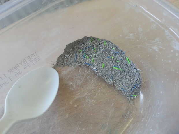 Una vez que se miden sus porciones de cemento, arena y polvo de piedra, combinan todos los ingredientes secos completamente antes de agregar agua.