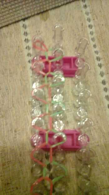 Hoy vamos a hacer un encanto fresa de bandas de telarPaso 1: posición del telarAsegúrese de que su telar es como se muestraPaso 2: colocar sus bandas verdes 1. Coloque las bandas verdes doble de la clavija central superior a la derecha2. Coloque las