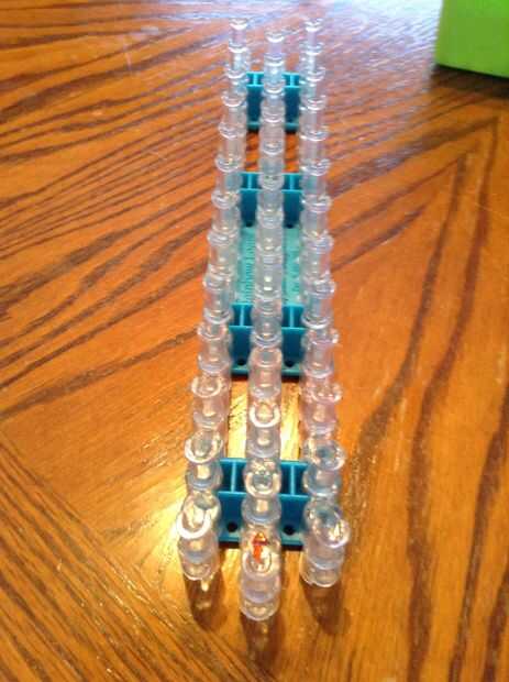 este es un diseño grande y fácil que parece una escalera! Va por supuesto que es el nombre del vamos a empezar!Fuentes:Telar del arco irisBandasGancho1 clip C/SPaso 1: Colocación de bandas Asegúrese de que la flecha es hacia fuera. Tomar una banda y