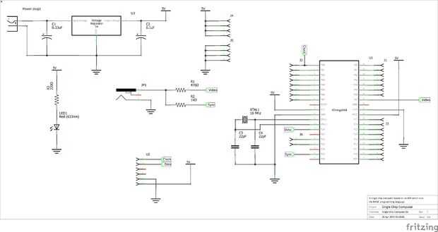 Los pernos de TVout PD5 (de sincronización) y PA7 (para video) y los pines del teclado PS/2 son PD0 (para datos) y PB0 (para reloj). Para alimentar el circuito, se utiliza un regulador de voltaje de 5V (junto con dos condensadores) para permitir que varios voltajes de entrada de fuente diferentes para conectarse (como un 9V PP3 batería o 12V de pared PSU). Un conector de barril de 2,1 mm (mismo enchufe como Arduinos) se utiliza para permitir poder suministros para conectarse. Un LED a bordo se utiliza para indicar cuando una fuente de alimentación está conectada.
