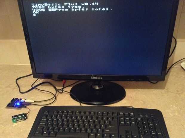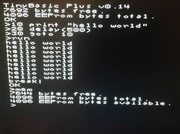 Una vez que había conectado un TV y un teclado PS/2, me encontré con el indicador TinyBASIC que indica la cantidad de memoria disponible para programas de la versión del software etc. mostrando todo funcionaba OK. TinyBASIC Plus informó 7692 bytes (7.692 KB) están disponibles para los programas y el ATmega 1284 P tiene 4 KB de EEPROM para guardar programas. Las imágenes en esta página muestran la PCB totalmente montado como TinyBASIC visualizada en el TV conectado.