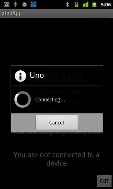 Instalar pfodApp en tu móvil y establecer una conexión con tu escudo de bluetooth como se describe en el pfodAppForAndroidGettingStarted.pdf. Llama mi conexión Uno, luego salir de la pfodApp. Entonces al hacer clic en siguiente en el icono de pfodApp, conecta automáticamente a la conexión sólo conoce, Uno el sketch de Arduino alternar el estado de salida y enviar de vuelta al mensaje de conexión cercana con el estado actual. Esto hace que el pfodApp salir y mostrar el mensaje.