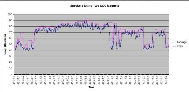En la tabla, conforme pasa el tiempo, los oradores fueron trasladados a 12" del medidor de decibelios, que describe la caída repentina en los niveles. Los baja a los niveles son más seguros para sus oídos! También depende de la canción que está jugando... como usted puede decir, hubo algunas interrupciones en nuestra canción donde baje los niveles!