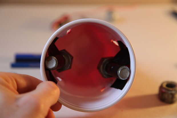 Después de que han cortado los agujeros alrededor de la taza, localizar lugares para sus tornillos dentro de la taza, asegurando que los pernos no cubren los agujeros que han cortado. Cinta de cada uno de sus pernos para el interior de la Copa con 3-4 trozos de cinta adhesiva eléctrica.