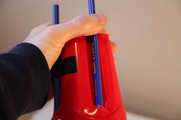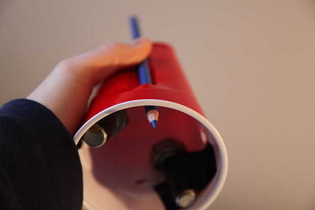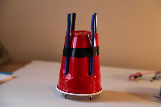 Una vez que has colocado tus pernos, Deslice cada lápiz a través de un agujero para que sobresalga de la parte "inferior" de la Copa. Cada lápiz debe sobresalir aproximadamente la longitud de una uña. Entonces, cada lápiz en lugar de cinta.