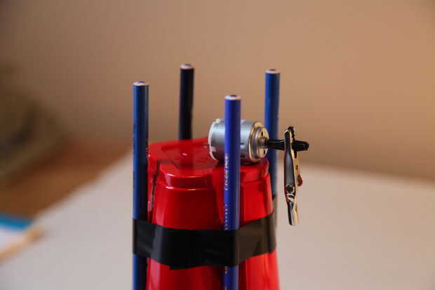 Una vez que el motor está listo, colóquelo entre dos lápices en el "top" del robot.