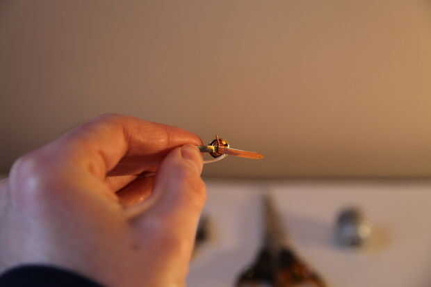 En primer lugar, envuelva el extremo pelado de su alambre alrededor del vástago del sujetador de latón.