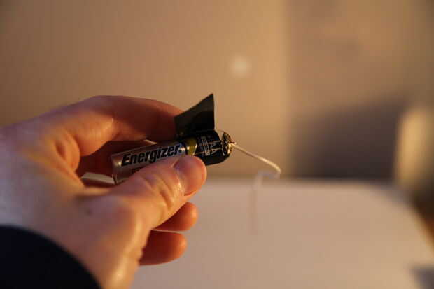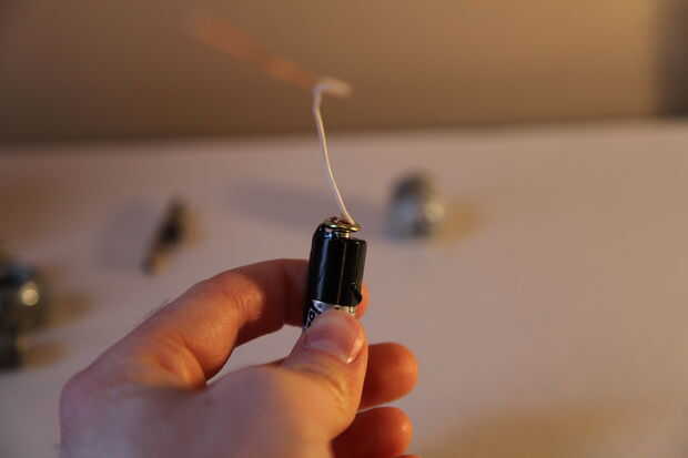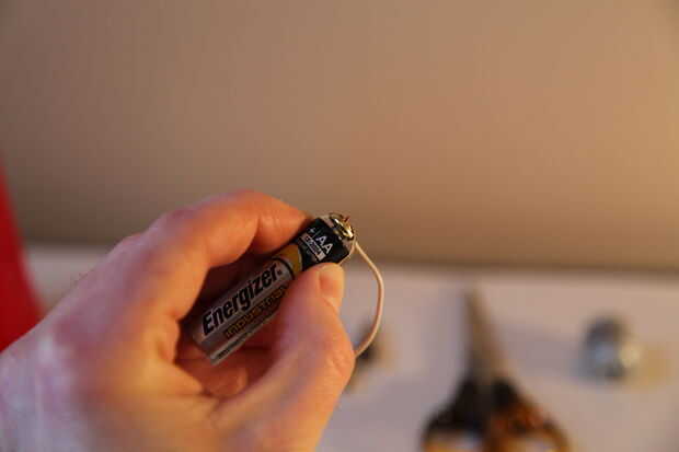 • Cada una de las piezas del tallo a los lados de la batería, cinta asegurando mantener buen contacto entre la cabeza del sujetador de latón y el extremo de la batería.