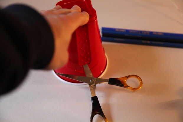 En primer lugar, mantener el "fondo" de la volcada solo taza y utiliza las tijeras para meter cuatro uniformemente espaciados agujeros alrededor de la "tapa" de la Copa.