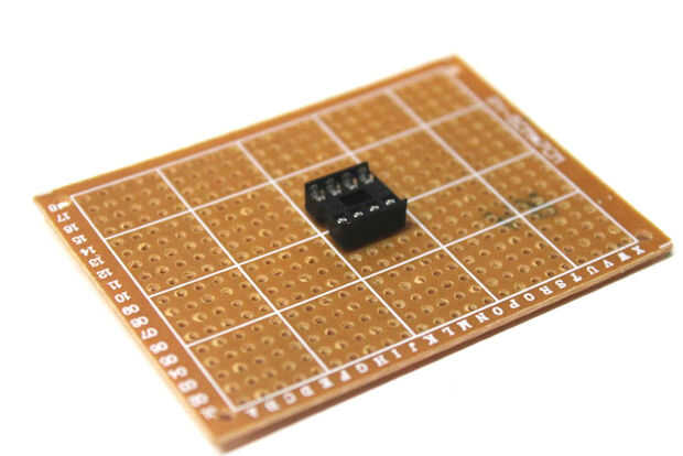 Muy bien! Ahora que sabemos lo que estamos haciendo, vamos a conseguir para soldar. Soldar el zócalo del IC cerca del centro de su perfboard. Esto nos dará espacio para llenar los hoyos de cerca con los otros componentes.