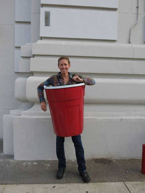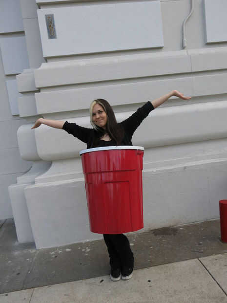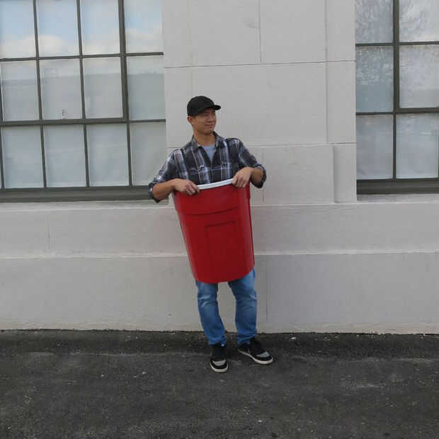 1. Comprar un galón 30 Rubbermade basura, pintura plástica de color roja y blanca2. cortar la parte inferior3. cortar mangos4. cortar orificios para los brazos5. pintura exterior roja6. Pinte el borde y el interior blanco