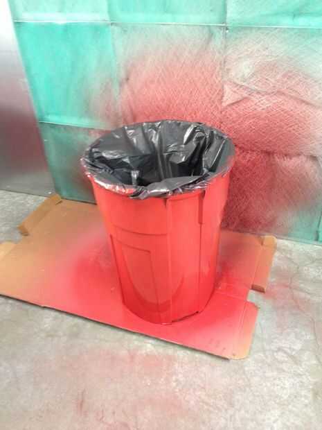 1. Comprar un galón 30 Rubbermade basura, pintura plástica de color roja y blanca2. cortar la parte inferior3. cortar mangos4. cortar orificios para los brazos5. pintura exterior roja6. Pinte el borde y el interior blanco