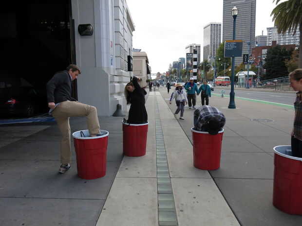 Paso en el poder desde la parte superior. Levante la lata y poner los brazos mediante correas. Puede que necesite un amigo para ayudar a (o ríen contigo: D)