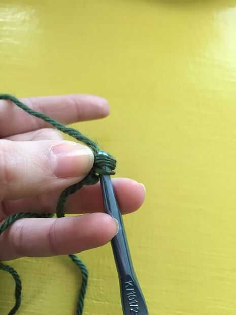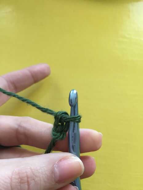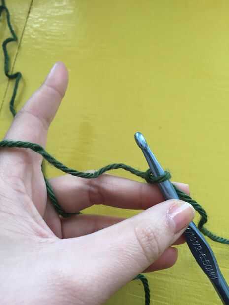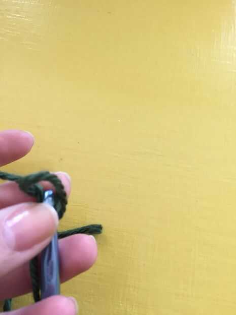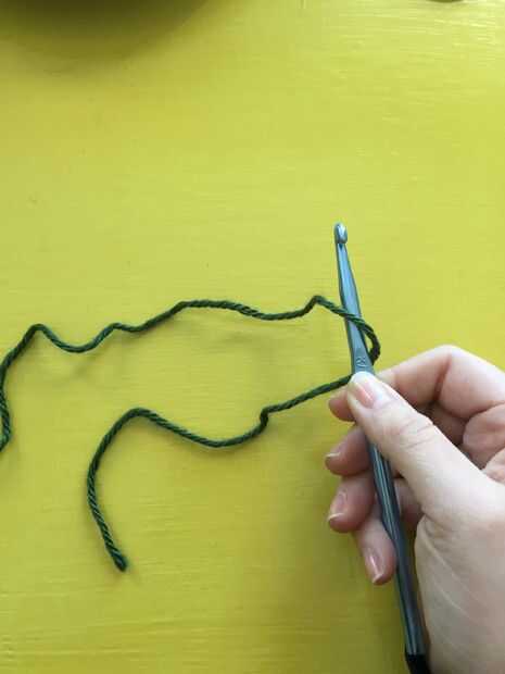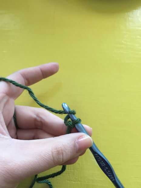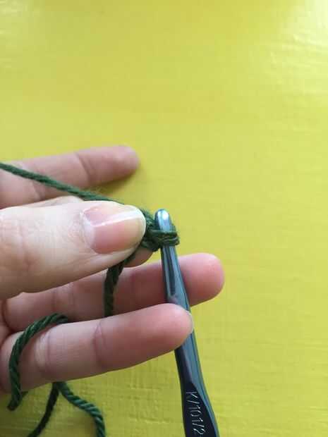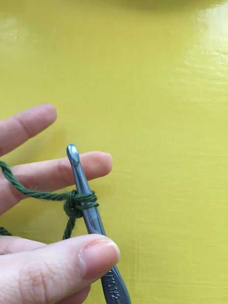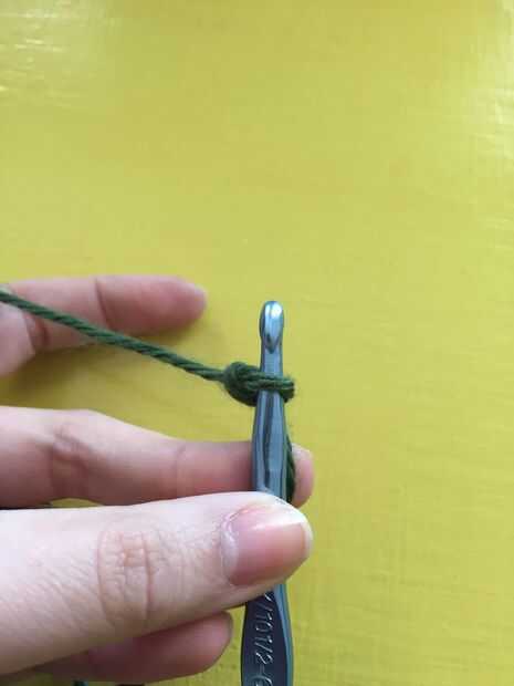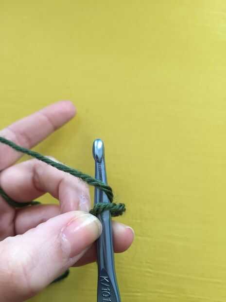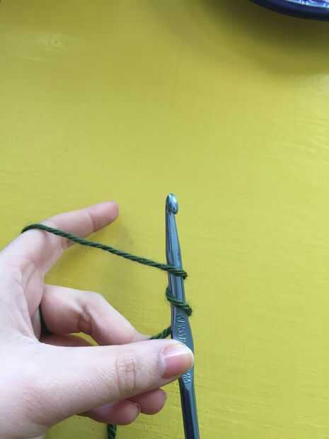5. toma la cabeza del gancho envuelve el trozo de hilo entre el dedo índice y el gancho. Harás esto por mover su mano derecha hacia abajo y luego lo giro para tener dos lazos de hilo en el gancho.