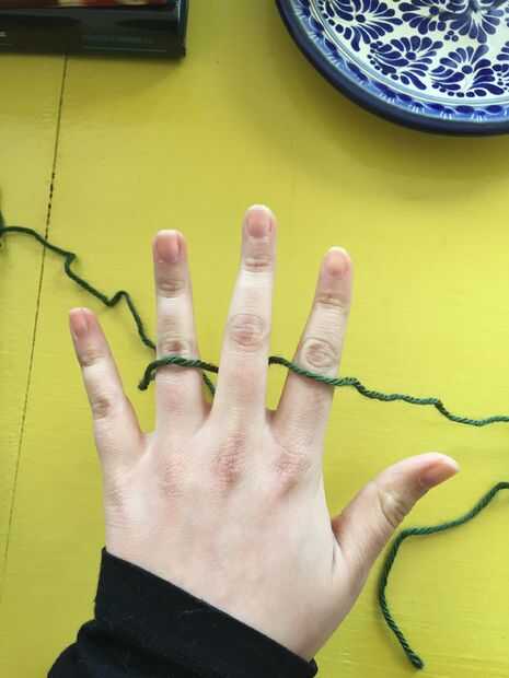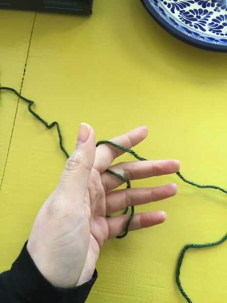 4. esta es la parte difícil ahora. Con la mano no dominante, tejen el hilo sobre y debajo de los dedos y pellizcar el extremo-ahora voy a llamarlo la cola-entre el pulgar y el dedo medio. Esto le permite alimentar el hilo en el gancho.