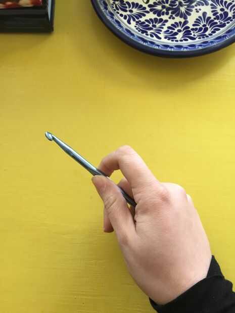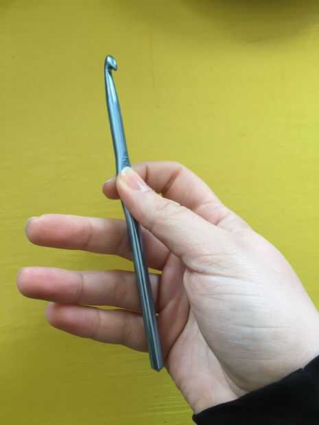 1. tomar su gancho y colocar en su mano dominante. Para mí, esta es mi mano derecha. Utilice el índice y el pulgar para sostener el gancho, como si fuera una pluma o un lápiz. Sujétela ligeramente esa muñeca está relajada.