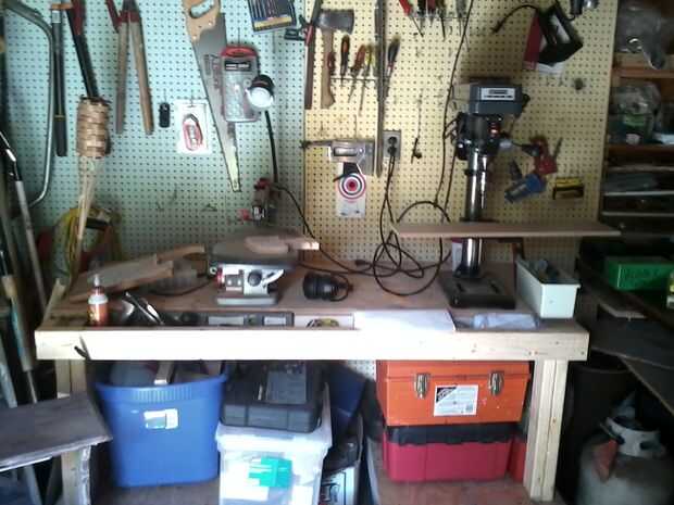 Ahora, su mesa de trabajo se hace, y todo lo que queda es agregar herramientas, o perros de banco si tu hacer un montón de mano herramienta de trabajo. Te recomiendo conseguir un tornillo de banco, o hacer uno. Hice mi mesa de trabajo en una estación dedicada de la sierra. El interior del Banco de trabajo es el mismo día que fue construido; la Cruz es el primer proyecto terminado construido en él (le pongo en notas en la fotografía, pero por alguna razón no funciona)