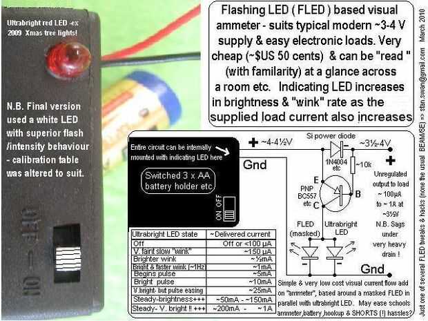 El escrito era que un solo LED que puede ser "leído" por el profesor estresado un vistazo a través de un sala de clase llena de gente, con flash tipo e intensidad relacionada con la demanda actual de. Movimientos de bobina móvil son ahora historia, por supuesto, y DMMs dedicados son demasiado grandes, o siempre soplan fusibles cuando los estudiantes se conectan incorrectamente. Aunque un micro popular (como el estimado PICAXE 08 M) de vuelta a una aplicación, no fueron utilizados en esta etapa en aras de la simplicidad y economía.