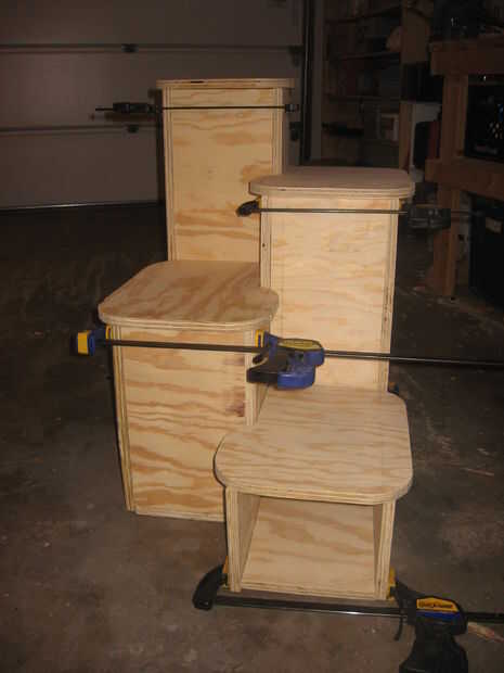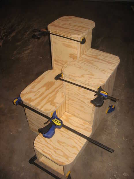 Después de que todas las piezas se cortan, empiezo con pinzas y unir las piezas y ver cómo encajan. No pegue o clavo o tornillo, simplemente colocarlos junto con las pinzas para asegurarse de que todo encaje (Foto 1). Antes de este disparo, tomé la parte superior de 1 2 3 y 4 y utiliza un antiguo café (diámetro de 6 pulgadas) o lo que le da una bonita curva y corte los bordes de las esquinas de todas las tapas (o pasos). Tapas 1 y 3 (ambos son exactamente iguales) se redondean los bordes frente dos y el borde derecho hacia atrás pero no la parte trasera esquina izquierda. La parte posterior izquierda borde o esquina tiene 8 pulgadas recta hasta el inicio de la curva hacia el exterior. Entonces el Top 2, enfrente de 1 y el 3 y redondear las dos esquinas delanteras y la parte posterior izquierda. Luego en el borde derecho hacia atrás vienen 8 pulgadas para arriba hacia el frente y hacer que la curva (Foto 1).