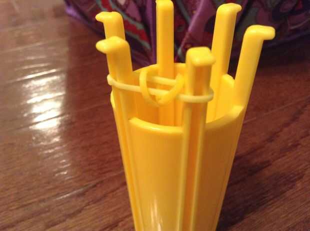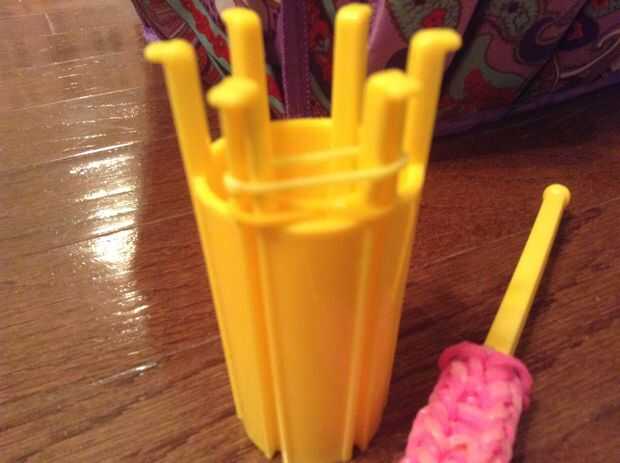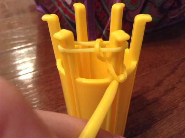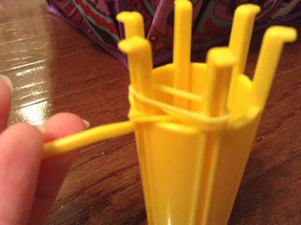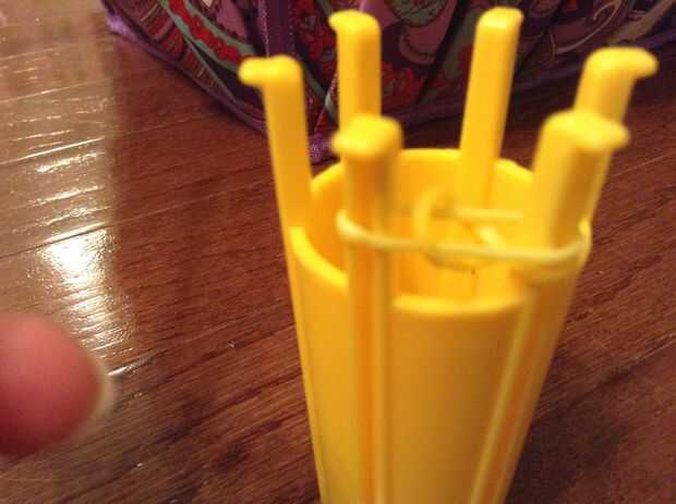 Paso 1: Se necesita:Un telar del arco irisAlgunas gomas de telar del arco irisUn gancho dePaso 2: Colocar las bandas Gire el telar para que la flecha es hacia usted y coloque las bandas (ver imagen)Paso 3: Ahora gire el telar para que la flecha es ha