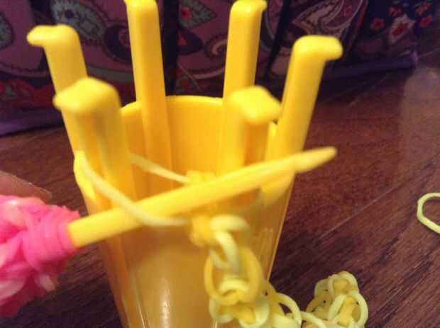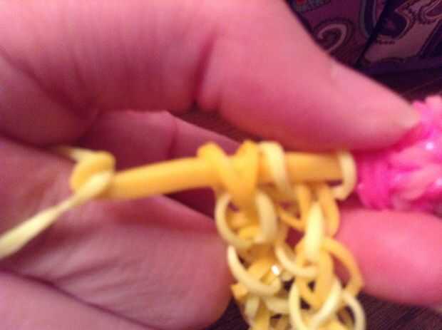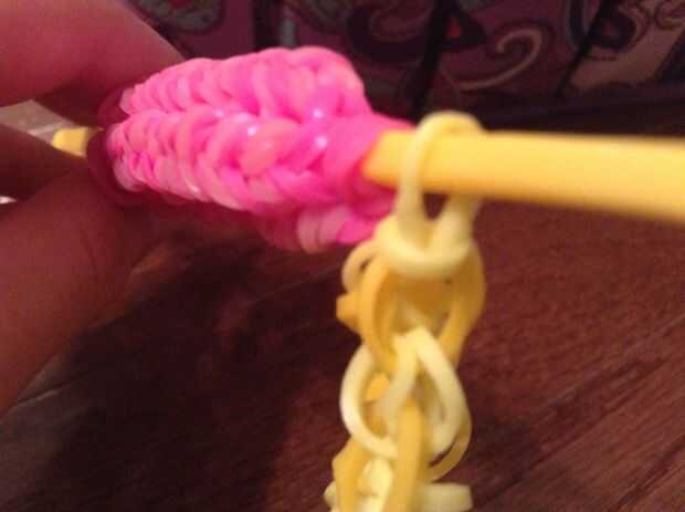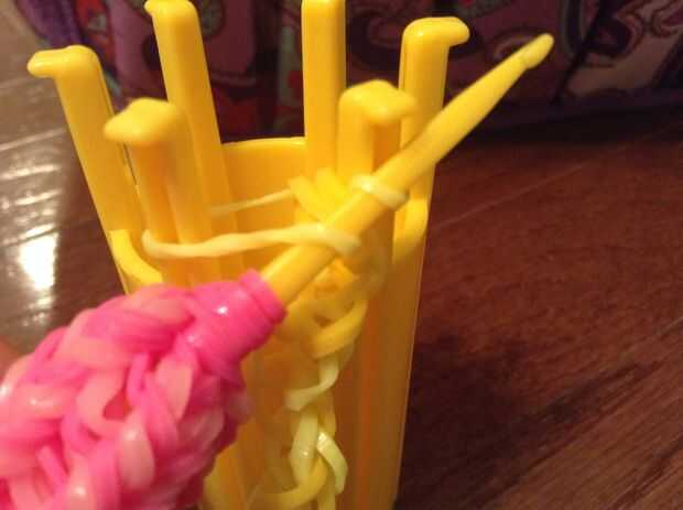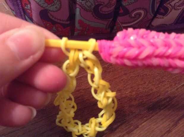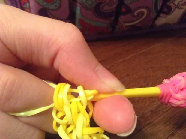 Deslice el gancho a través de las bandas en los postes. Tire de la pulsera de tu mini telar. Tomar una banda y deslice el gancho en la banda todas las bandas. Luego, subir la otra parte de la banda en su anzuelo, toma el lazo inferior, (averiguar cuál es la parte inferior, gire el gancho en posición vertical.) y tire de ella en su gancho. Apriete el nudo.